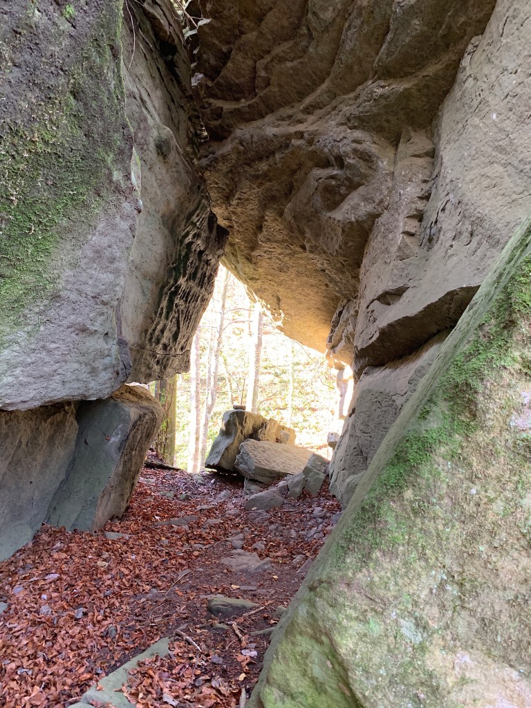 En fi, reprenem la marxa. Una estona costa amunt. Una bona pujadeta. Agafem el camí dels gossos de caça, el seguim. Ara, però, el camí no sembla pas que continuï. De sobte, a dalt, se senten uns bels llastimosos. Bee!, bee!, bee! Bee!, bee!, bee! Veiem una cabra amb un aire vigilant, resolt: acaba de parir dos cabridets. Entenem que les cries criden la mare. Ai!, quin belejar! Ens n’apartem, no fos cas que els espantéssim. Tirem amunt, i trobem uns pedrots enormes, aquí i allà. Calls de parets altes i balmes de barrets ben grans. Una meravella de veure. Trobem també la Roca dels Francesos, i la seva balma. El nom prové de quan la guerra dels “francesos”. La gent del país en van atacar una bona colla, de “gavatxos”, i els llançaren daltabaix d’aquest roquer.