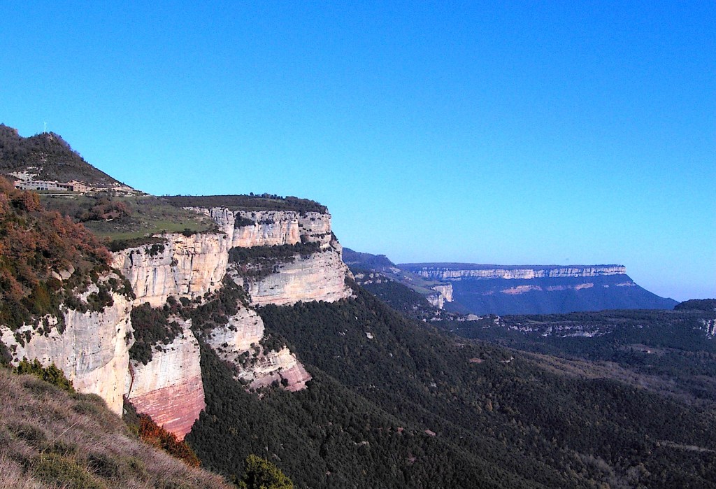 El Pla Boixer i el mirador de la Rocallarga (1.187 m). Hem caminat tres quarts d’hora fins aquí. El Pla Boixer (1.110 m) deu el nom a les matades espesses de boixos que el cobreixen en bona part. Cinglera colossal de 300 metres, que és el llegat d’una intensa història geològica. Des de la punta, ran de cinglera, hi dominem unes vistes espectaculars: Rupit, Sant Joan de Fàbregues, l’Agullola, Pla de Montdois, la cinglera del Far, els embassaments de Sau i de Susqueda, les Guilleries i el Canigó. A vegades, hi pots contemplar tot un mar de boira. Espectacular. Magnífic. Pau i silenci, que sembla que pugin de les fondalades. Roca calcària d’origen marítim a la part superior de les cingleres, i una capa vermellosa a la part inferior, molt més erosionable. El passat geològic d’aquesta zona es pot entendre amb la presència abundant  de nummulits de forma de llentilla i fòssils marins de colònies de coralls.