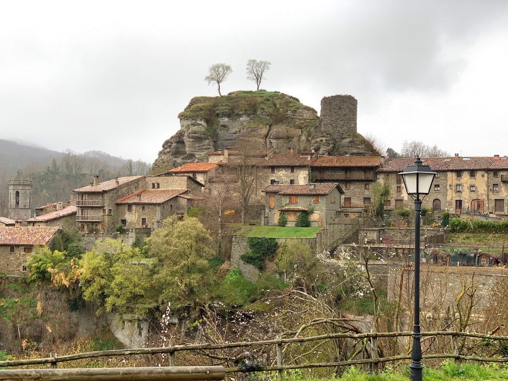 I aquí agafem el camí de Santa Llúcia, que de primer s’ensota una mica i tot seguit és de pujada suau. L’anada a Santa Llúcia és un passeig on els veïns de Rupit han bastit un barri nou. Cases noves força grans, que segueixen el model constructiu del poble, amb lleugeres variants. Cases de pedra, amb balconades de fusta plenes de flors. Tot plegat és una delícia. Passeig molt recomanable, sense cansament. Vora el camí hi ha una font i uns bancs on seure. Dues dones, interessants, desimboltes i atractives, amb vius vestits clars, hi estan assegudes gaudint de la visió del poble, passejant els ulls per les façanes de les cases i prenent-hi el sol. Mirador privilegiat del poble de Rupit. Hi fan fotografies i tot, clac! Aquest exercici les entreté una mica, perquè Rupit fa goig de contemplar. I aquí cal fer parada.