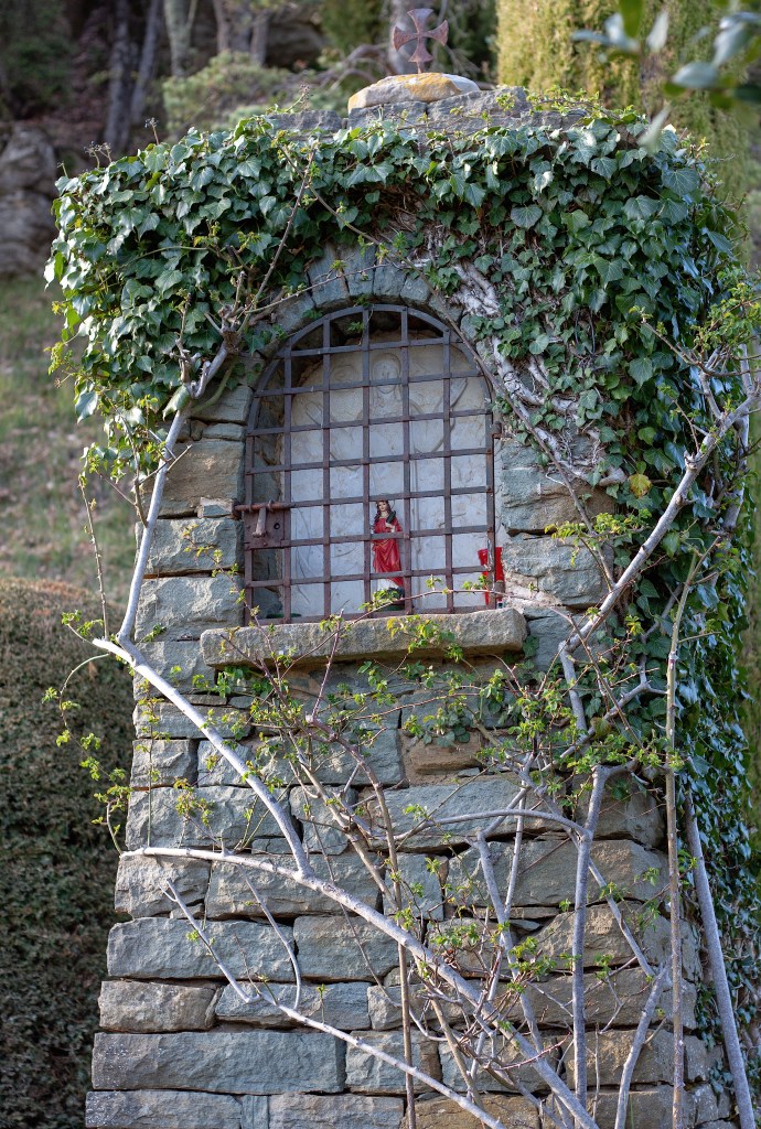 Pedró o capelleta de Santa Llúcia. A la vora mateix de la casa, s’aixeca, digníssima, la capella de Santa Llúcia, posada en un lloc esglaonat, voltada de xiprers ufanosos, que escampen el dolç perfum, i als peus del padró, un grèvol de fulles brillants i fruits de color vermell. (Heus aquí que Josep Carner, en el poema Xiprer, hi diu: Xiprer, se’t veu cenyit de roses, sovint, en un verger.) Columna esvelta, de pedra, amb una fornícula per a la imatge de la santa i coronada amb una creu. (Els seus atributs són una palma, símbol del seu martiri i l’espasa, amb la qual li van travessar el coll en els temps de de les persecucions de l’emperador Dioclecià, a l’inici del segle IV. A vegades, un llum d’oli, un llibre, o bé porta un plat petit amb els seus dos ulls. Se’ls va arrencar ella durant el martiri. El seu promès pagà, que la va denunciar per cristiana, adorava els seus ulls, de manera que ella se’ls va arrencar perquè els hi fessin arribar.) “Que Santa Llúcia ens conservi la vista”, aquesta és l’advocació popular. La santa apareix sempre amb els ulls ben posats i ben oberts, i els que porta al platet és un altre parell de recanvi. No la podien pas pintar amb les conques buides (!). Aquest pedró és fruit de la devoció popular arrelada des de temps molt reculats. Santa Llúcia: estel i rosa. Racó deliciós.