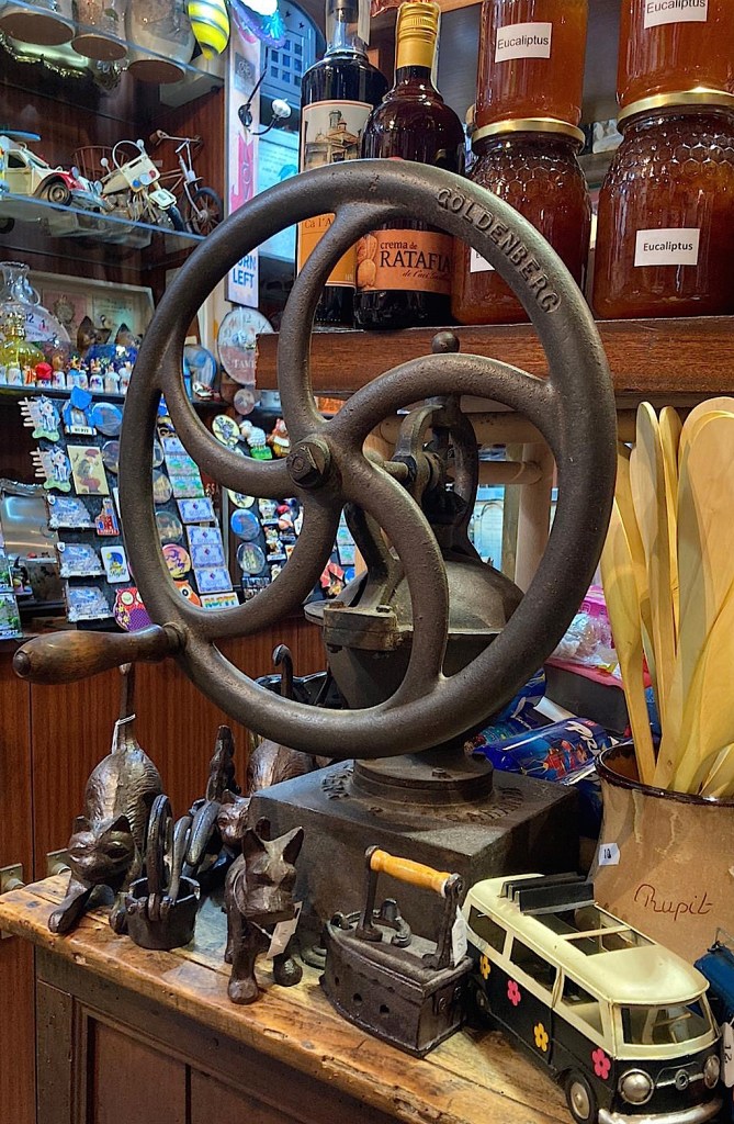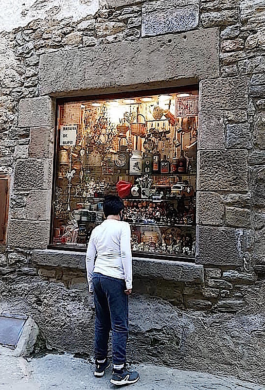 En passar per la botiga, la gent hi tomba el cap. Allí dins, les parets estan plenes d’una infinitat d’objectes. (Les quatre parets hi han desaparegut.) La quantitat d’objectes és absolutament prodigiosa. Ben proveïda: no hi cap un article més. Quant de temps t’hi estaries distret observant-ho tot! Hi ha tantes coses suggestives per comprar. Del sostre, en pengen peces d’aram català, que rellueixen talment or vermell: xocolateres, brasers, gerres, paelles, escalfallits, càntirs i olles. Campanes de sons metàl·lics. I esquelles de totes menes i mides, de vaca. Hi ha bastons de fusta, bastons de bambú per a portar a la mà i repenjar-s’hi caminant, fets a mà. Rellotges de totes mides, de forma quadrada i de forma esfèrica. Espardenyes de vetes. Comerç de vetes i de fils. Ampolles de licors. Cafè. Xocolata. Llibres de la comarca de la Garrotxa i de la comarca d’Osona. Barretines. Barrets, i tot. Diaris i revistes.