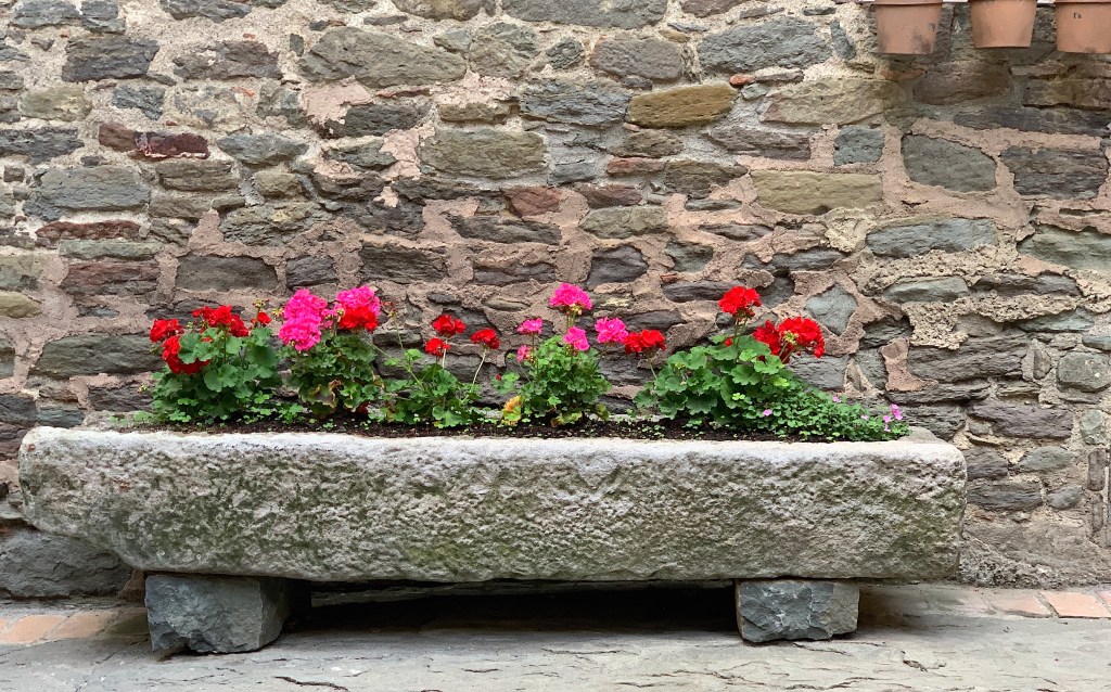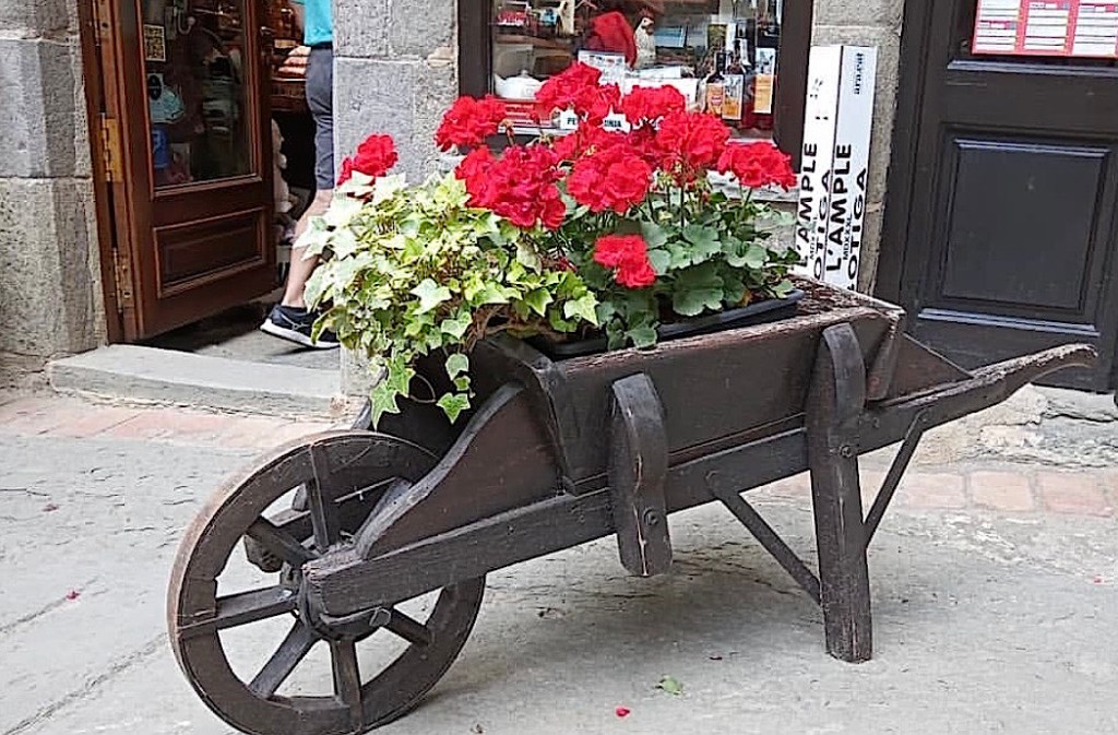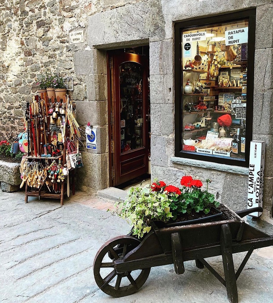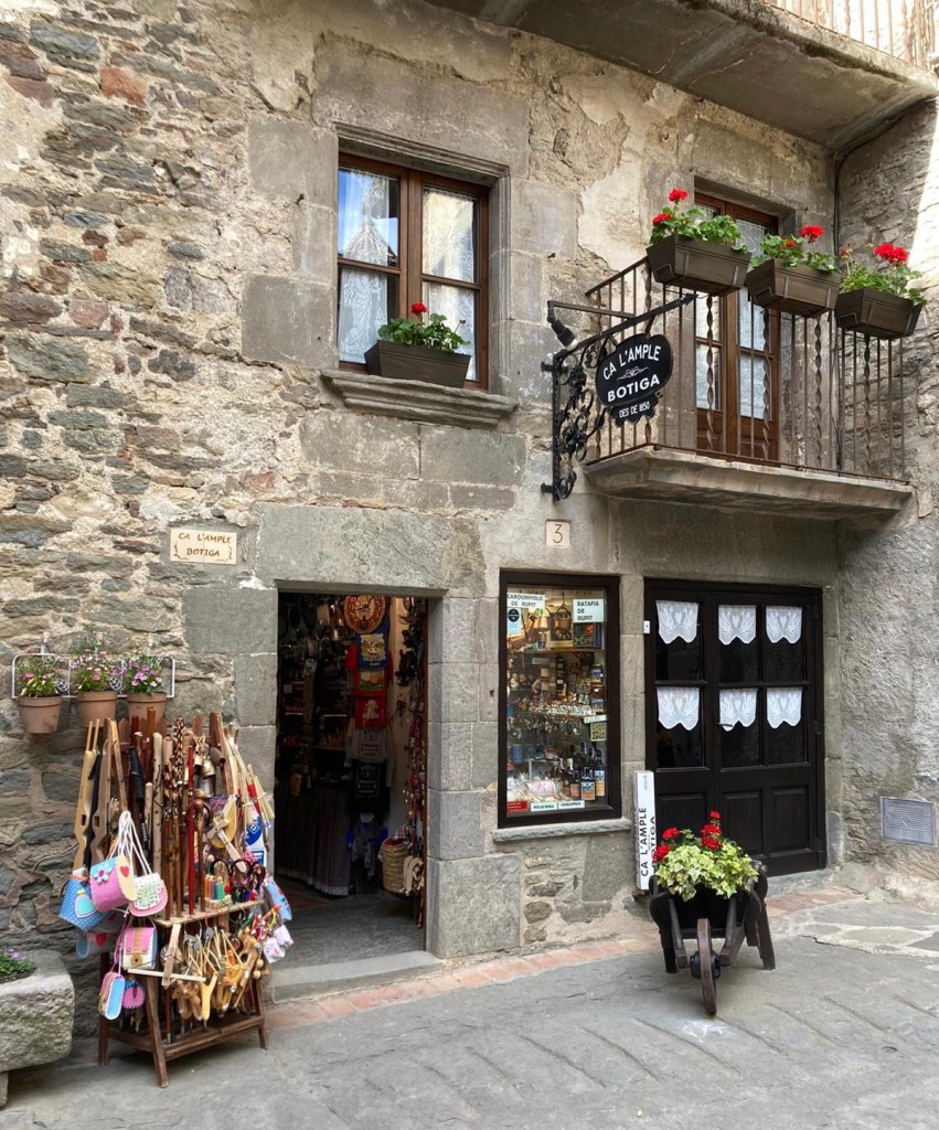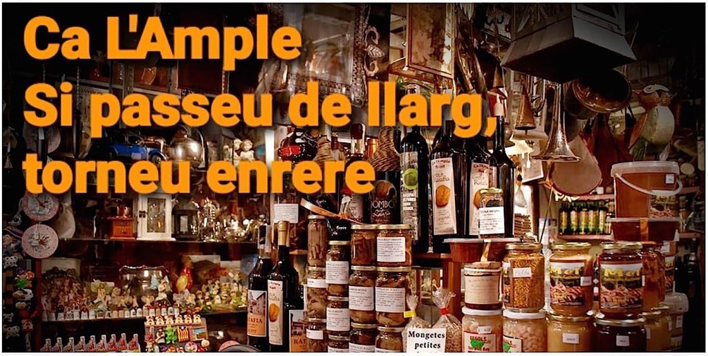 El poble es diu Rupit, “una petita joia vella”, segons les paraules de Joan Triadú. Al centre del poble, a prop de l’església, es troba una magnífica botiga, Ca l’Ample, que continua sent tan característica i tradicional com sempre. Hi ha al peu de la porta d’entrada, un carretó de fusta amb geranis d’un vermell molt pujat, que és una preciositat. La botiga és esplèndida i fresquívola, i sigui al temps que vulgui, l’aire de l’interior contrasta vivament amb el de fora. Ah!, i fa olor de caramels de menta de frescor agradable. Tot hi és net i brillant. La gent s’encanta davant l’aparador, en què no falta res: “Per què t’hi encantes?” “Perquè aquest aparador és realment singular, perquè plau de mirar-lo. És divertit de contemplar-hi la barreja de reflexos.”