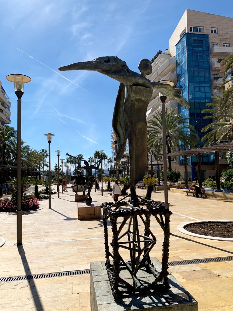 Les muralles de l’alcassaba del segle X delimiten el casc antic. I ara travessem La Alameda, que és el pulmó de la ciutat. I l’Avenida del Mar, que és un magnífic museu a l’aire lliure amb deu escultures de bronze: Gala gràvida; Mercuri (entre els grecs, Hermes); Dona nua pujant l’escala; Cavall amb genet; Perseu amb el cap de Medusa; Don Quixot assegut; Gala a la finestra; Trajà a cavall; Home damunt d’un dofí i Elefant còsmic. Aquestes escultures són atribuïdes a Salvador Dalí. Ara bé, la Fundació Gala-Salvador Dalí mai no ha reconegut que fossin d’ell. (Doncs bé, serien unes reproduccions d’unes petites peces de Salvador Dalí.) Dinem en un restaurant de la banda moderna de Marbella. Havent dinat, visitem La Virginia, que és un poble que es troba ben a prop de Marbella. Ben menut però amb molta vida. Un grapat de cases molt bufones, construïdes pels arquitectes Juan Manuel Figueras, Freddy Wildman i Donald Grey, de les quals Orson Welles, Claudia Cardinale i Lola Flores es van enamorar. Avui són un secret. A la part més alta, una capella petita. Arreu, fonts i una vegetació exuberant. Places petites i estrets carrerons de pedra. Enmig dels testos que crien plantes, un rètol: Es prega que respecteu el descans i la intimitat dels residents. L’avís ens fa entendre que aquest indret no és un decorat.