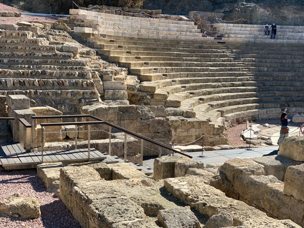 Havent dinat, el Teatre Romà. A l’entrada del recinte arqueològic, la gent pren el sol tranquil·lament al pedrís. Ben fet. Hi ha força animació. Molt a prop de l’entrada al jaciment romà, una gran plafó de fusta conté un text en llatí: un fragment de la Lex Flauia Malacitana, promulgada per Domicià (81-96 dC), en la qual s’estableix que Malaca esdevé Municipium Latinum: