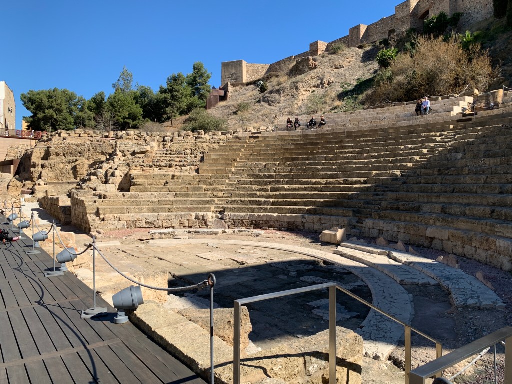Teatre Romà de Màlaga –el somni de ser un altre, això és el teatre. Per als romans, màscara significa persona: si el rostre és “el mirall de l’ànima” (Ciceró), la màscara és el mirall del rostre. Els actors coberts amb les màscares (personae) accedien al l’elevat pulpitum a través d’unes portes laterals (versurae). Veiem que tenen entrada lliure. Així m’agrada, no com a altres llocs. Espais que visitem en aquest teatre d’una acústica excel·lent: cauea (graderia de 65 m. de diàmetre), aditus maximus o iter (passatge cobert per una volta de mig punt, per on s’accedeix a l’orchestra), orchestra (espai semicircular reservat a les elits locals), scaenae frons (edifici escènic, que era un teló de fons espectacular, tot de pedra, i l’escenografia) i el pulpitum (estrat o escenari on es representen les obres en aquest edifici d’espectacles: ludi scaenici (segles I-III dC). Un teatre com els déus manen. Superb. L’estudiem: cauea. orchestra. postscaenium. proscaenium. pulpitum. scaena. summa cauea. media cauea. ima cauea. També disposa d’un centre d’interpretació del jaciment ubicat ben bé al costat. Sortim. Després, a peu anem a visitar també el Museu Picasso, que té unes peces de primera. Minotaure (1934). Dona amb barret (1938). Retrat de Dora Maar (1939). Susanna i els ancians (1955). Cap de faune (escultura de fang, 1948). Faune sedent (escultura de fang, 1951). A la botiga del museu comprem algunes postals. Al bar del museu berenem. Sortim. Passejada pel carrer Marqués de Larios. Cor de la ciutat. Via molt comercial, i també sabem que és el carrer més car per viure de Màlaga. Cafeteries ben antigues i gelateries. Ara, aquest carrer fa molta patxoca amb els fanals i els grans arcs daurats, portadors de sols i fulles, i posats en reguitzell. Una via plena de reflexos lluminosos. Tot plegat fa el carrer molt i molt elegant.