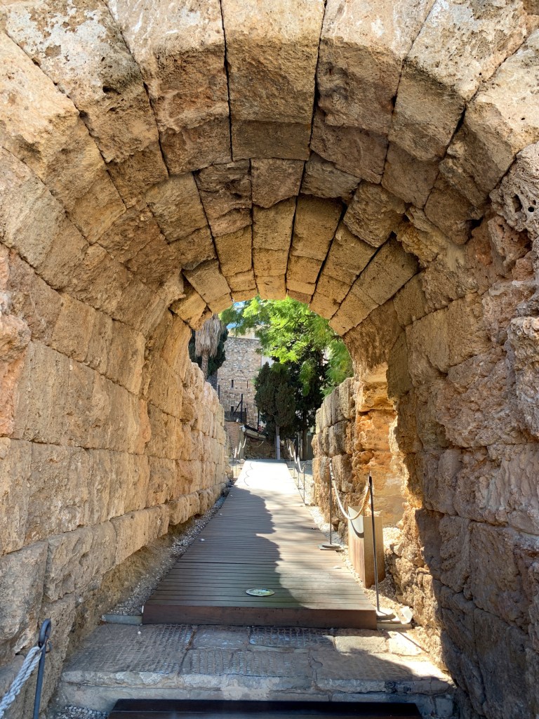 L’Alcassaba, palau i fortalesa d’origen musulmà (segles XI-XV). Agafo el camí esglaonat que passa constantment pel mig d’un jardí amb pins i xiprers. Finalment arribo al palau de poderoses i altes torres. L’alcassaba, de fet, té tres parts: les fortificacions de l’entrada, amb un camí sinuós que les travessa. Un segon recinte emmurallat o Recinte Superior i els palaus residencials del governants de la Màlaga musulmana –Cuartos de Granada– i un nucli o barri d’habitatges per a la tropa i per al servei, del segle XI. I al costat d’aquest palau àrab s’alça el Castell de Gibralfaro (segle XIV), el qual els musulmans l’habiliten com a fortalesa de defensa. Des d’aquí, ho dominem tot: l’Alcassaba, el barri pesquer de Pedregalejo i el Palo, Platja de La Malagueta, Jardí Botànic, Plaça de Toros de La Malagueta, Montes de Málaga i l’Ajuntament. Hi contemplem l’amplitud de la badia i també el circ de muntanyes que envolta la ciutat. El camí de baixada i de tornada me l’estalvio perquè em deixo temptar i agafo l’autobús. Així en faig més via. Ara és qüestió de dinar. Trobem un restaurant que té bon aspecte.