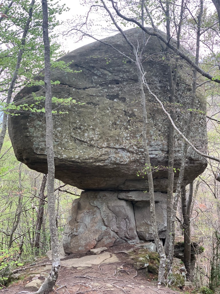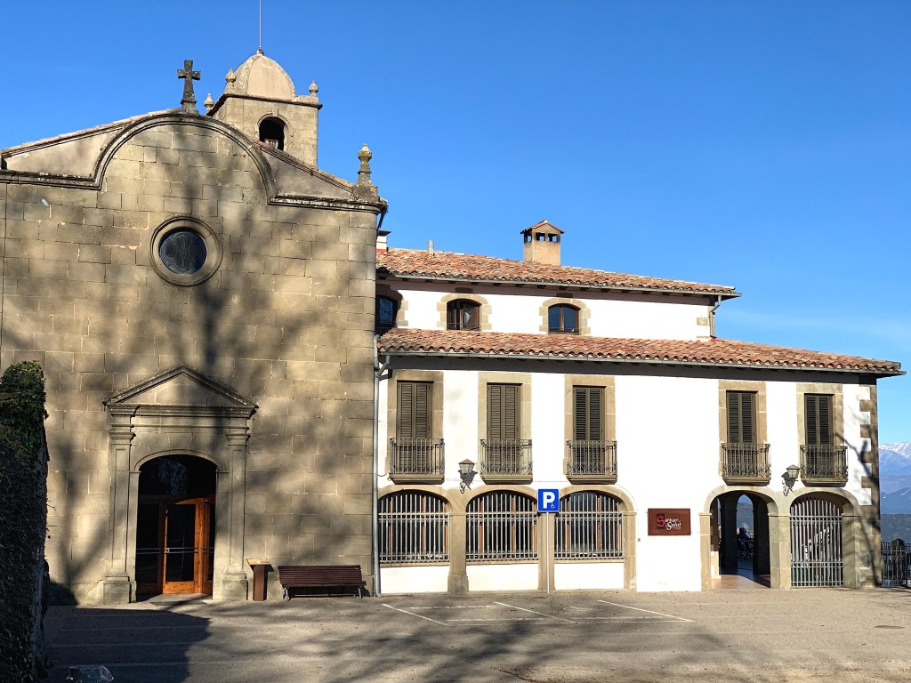 Hem passat a la terrassa del santuari, que és molt agradable. Hi prenem un refresc tot fent conversa amb en Francesc, responsable de l’hostatgeria del santuari. I li expliquem que hem visitat el Bolet de Toia (un lloc molt especial!),  que no dinarem pas aquí perquè encara no tenim gana. Així, doncs, tornem endarrere tot refent part del camí. Per una pista entre els faigs arribem a Les Roques Encantades.