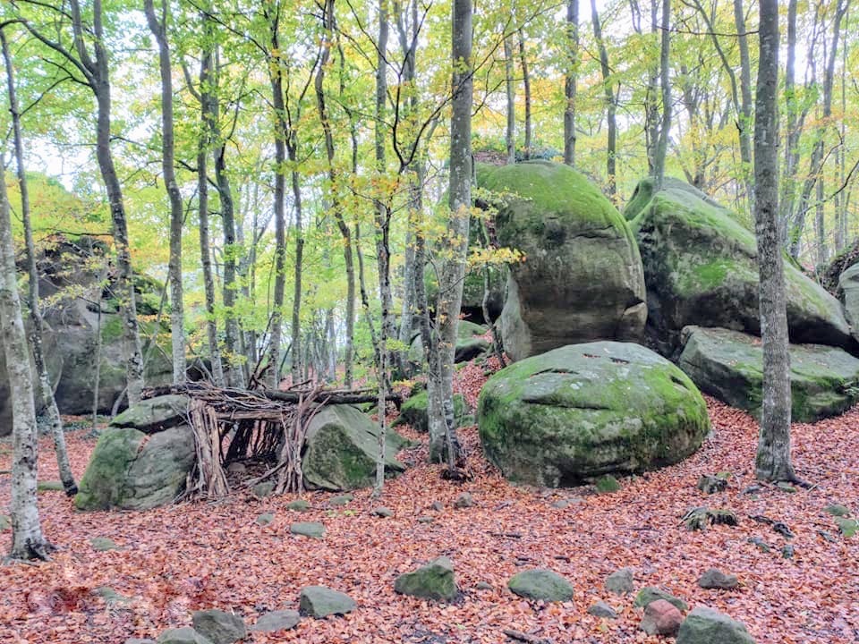 Si alguna vegada hi aneu, allí podreu gaudir d’un espai de joc magnífic i ben gran. Visió de grans pedres, que es transformen en castells o bé agafen l’aparença d’animals fantàstics, bruixes amb nas de bec o fades de bella estampa, que en diades especials hi corren de nit a la claror d’unes torxes. Pedres per grimpar. Coves per descobrir. Els braços ben oberts per abraçar amb força els arbres. Construcció de cabanyes. Joc de fet i amagar, durant els quals els nens hi criden i hi corren sense alè (trap-trap, trap-trap), xops de suor. Caceres d’ocells amb un tirador de goma de bona punteria. Estudi d’una fageda. Recollida de fulles de tons vermellosos, que el vent fa córrer. Observació dels habitants d’aquest bosc, per exemple, un esquirol, amic dels arbres enlairats i corpulents, que s’està atipant com un lladre: garranyic-garranyeccrunc-crunc, i tants animals diferents amagats sota les fulles. Cerca de fòssils i insectes. Adonar-se del soroll d’una fulla en caure, de l’aleteig dels insectes. Dels sorolls d’aquest bosc, les veus del bosc: el cant dels grills (ric-ric, ric-ric), les corredisses dels conills, els refilets i els cants dels ocells. Contemplació dels colors dels arbres, i els moviments i els sorolls de les branques. Abans de llevar-se la claror del dia, matem-hi gegants, o bé correm per totes bandes per viure-hi esgarrifoses aventures. Observació del vol dels ocells, que sorolla l’aire quiet. Lectura de contes de bruixes i follets. Cantar i ballar, si convé. Cançons i rialles. I a la llunyania, l’esquelleria sorprenent d’un ramat de vaques. I també cal destacar que el camí que uneix el Santuari de la Mare de Déu de la Salut amb Les Roques Encantades és deliciós.